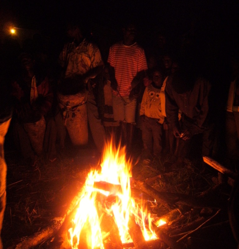 Sans dire un mot, GUIMÔWARA-LE-SAVANT, éteignit son transistor, et sortit se soulager de son pressant besoin d’uriner, au pied du kapokier le plus proche. Il était environ deux heures du matin. Où aller, et que faire à pareille heure ? Il s’approcha alors du foyer aux braises partiellement ardentes, dressé au milieu du campement. BEKA-LE- Pygmée, venu entretemps chercher de l’eau à boire, lui céda sa place, avant de se dépêcher pour regagner son poste de surveillance, juché sur un arbre situé à quelques dizaines de mètres de là. Le patriarche, vieux MBI-NA-ALA MIDOWA, toujours muni de son fusil de marque «Bandaguikwa», et le jeune KPARAKONGO, toujours armé de son arc «Kpembi-Kpomo» étaient en pleine conversation.