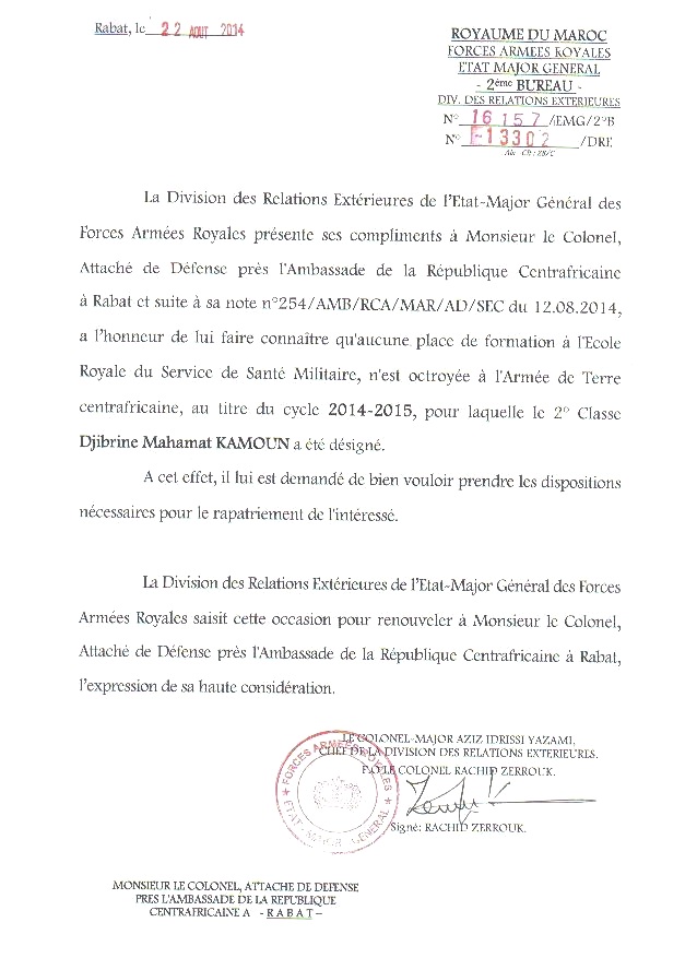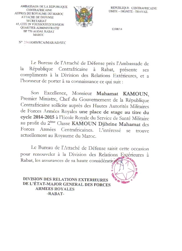 A peine nommé le 10 Août 2014, Mahamat Kamoun, avant même de désigner les membres de son gouvernement et de composer son cabinet au niveau de la primature, choisissait dès le 12 août 2014, sinon d’user et d’abuser de son titre de Premier ministre centrafricain, du moins, de mettre son autorité au service de ce qui n’est rien moins qu’une preuve de népotisme et de favoritisme, un trafic d’influence et un abus de position dominante, le tout à des fins purement égoïstes. En témoigne, sa vaine tentative de faire admettre spécialement et uniquement son propre fils, le nommé Kamoun Djibrine Mahamat, qui n’en remplissait pas les conditions, à l’Ecole Royale du Service de Santé Militaire (ERSSM) de Rabat au Maroc. Voir document ci-dessous, tout droit sorti de l’immeuble Pétroca :