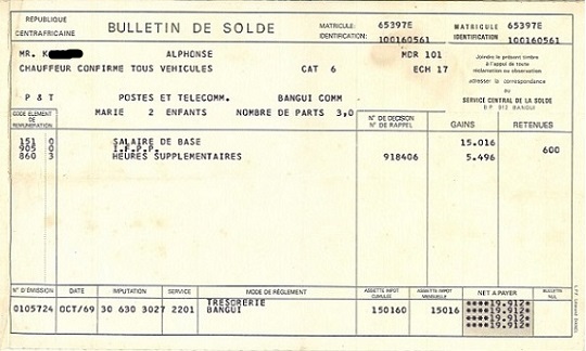 De nos jours, le salaire en RCA, est devenu une affaire de « gara ti cinq kilo » comme on dit chez nous; une affaire « publique », au sens où tout le monde sait, quand il n’est pas payé, quand il doit être payé, où et comment cela va se passer. Le salaire ne concerne plus seulement le travailleur comme du temps de Papa Alphonse, où les seuls signes extérieurs de la fin des mois, étaient le vin conditionné en dame-jeanne ou en bouteille d’un litre et vendu sous diverses appellations : Nabao, Kiravi, Sovibor, CDB. Une fois par mois ainsi, à l’occasion de la paie, Papa Alphonse, ses amis et voisins, se retrouvaient chez l’un ou l’autre, pour boire, causer et fumer des cigarettes de marque « Siat » , « Brazza jaune, Brazza bleu, Brazza vert » etc. Pendant ce temps, leurs épouses s’activaient à la cuisine. A l’heure des repas, les plats de « gnama na coco, gnama na Ngoundja ou fini mboto », sortaient du coin de chaque maison, pour converger vers la table destinée à accueillir la compétition gastronomique du jour. Quant à nous autres, bambins en gros caleçon rouge appelé « da-gbi » et chaussés de sandale plastique « djogo-djogo » de couleur blanc, jaune ou bleu, c’était aussi nos jours de « paie » sous ses formes enfantines: bouffe, boissons sucrées « Soda », « Canada dry », bonbon, jeux divers etc…
